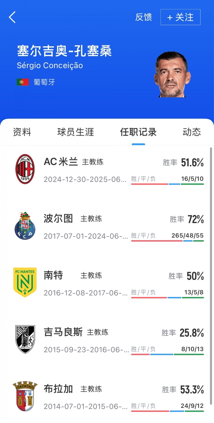 孔塞桑配置于1974年,曾担任波尔图、AC米兰等球队主帅,今夏卸任米兰主帅。