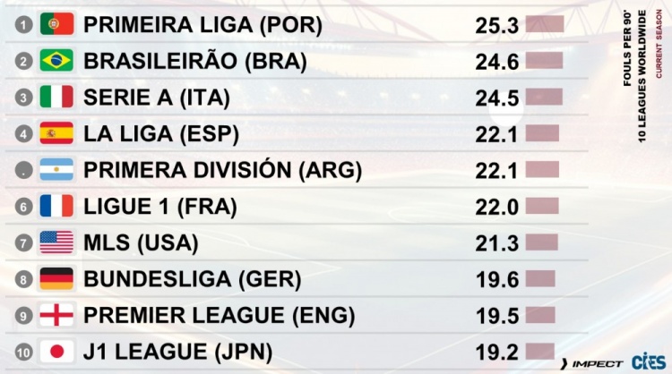 全国联赛每90分钟犯规次数名次:葡超25.3次居首,英超19.5依次9