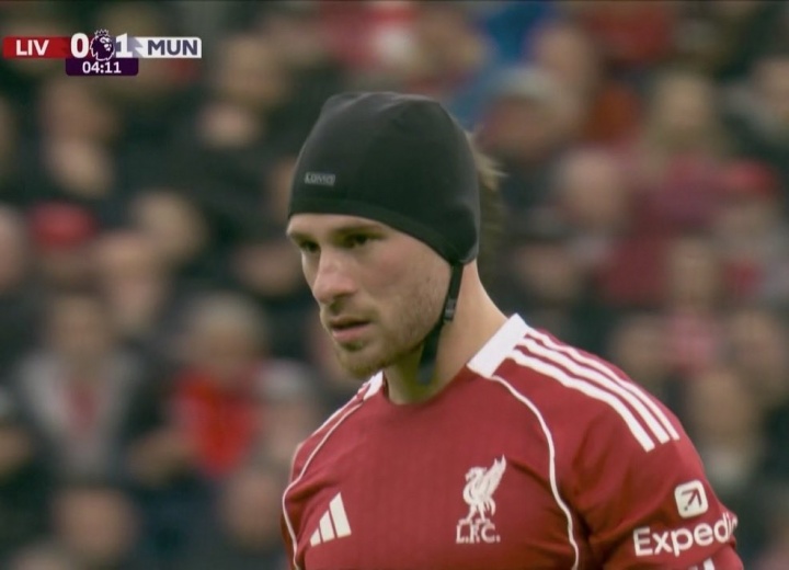 比赛刚启动姆伯莫破门,在进球前的争顶,范迪克争顶中肘击麦卡利斯特。之后麦卡继承治疗,头上戴上了帽子链接比赛。