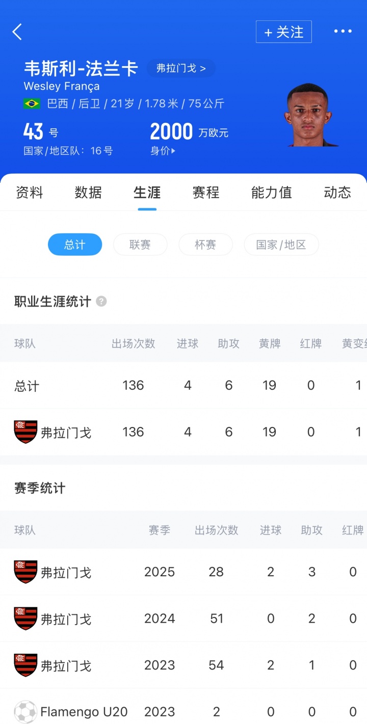 21岁的韦斯利司职右后卫,本赛季为弗拉门戈28场孝敬2球3助攻,德回身价2000万欧元。