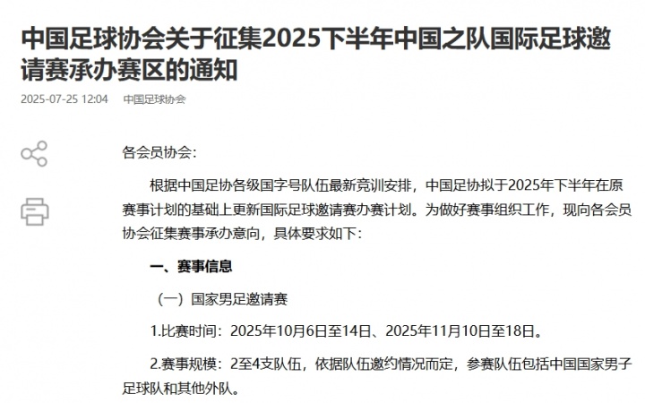 官方:国足将于10月、11月办邀请赛,足协现公开搜集赛区经办