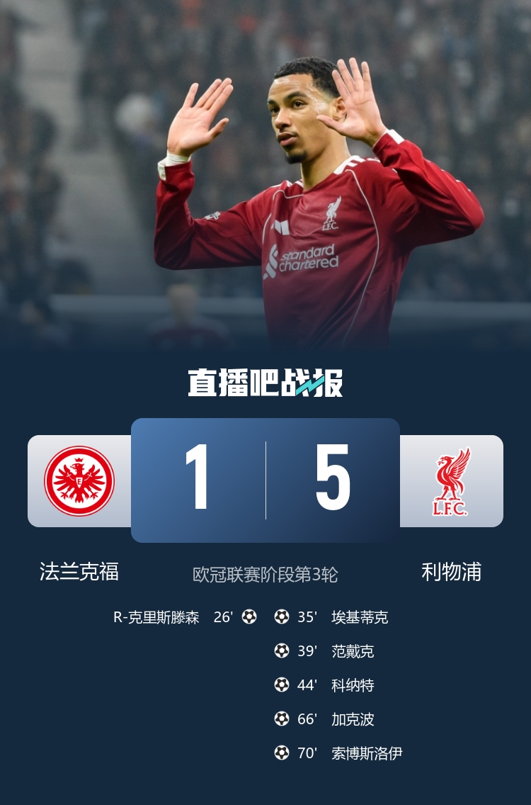 10月23日讯 在本轮欧冠,利物浦5-1大捷法兰克福。