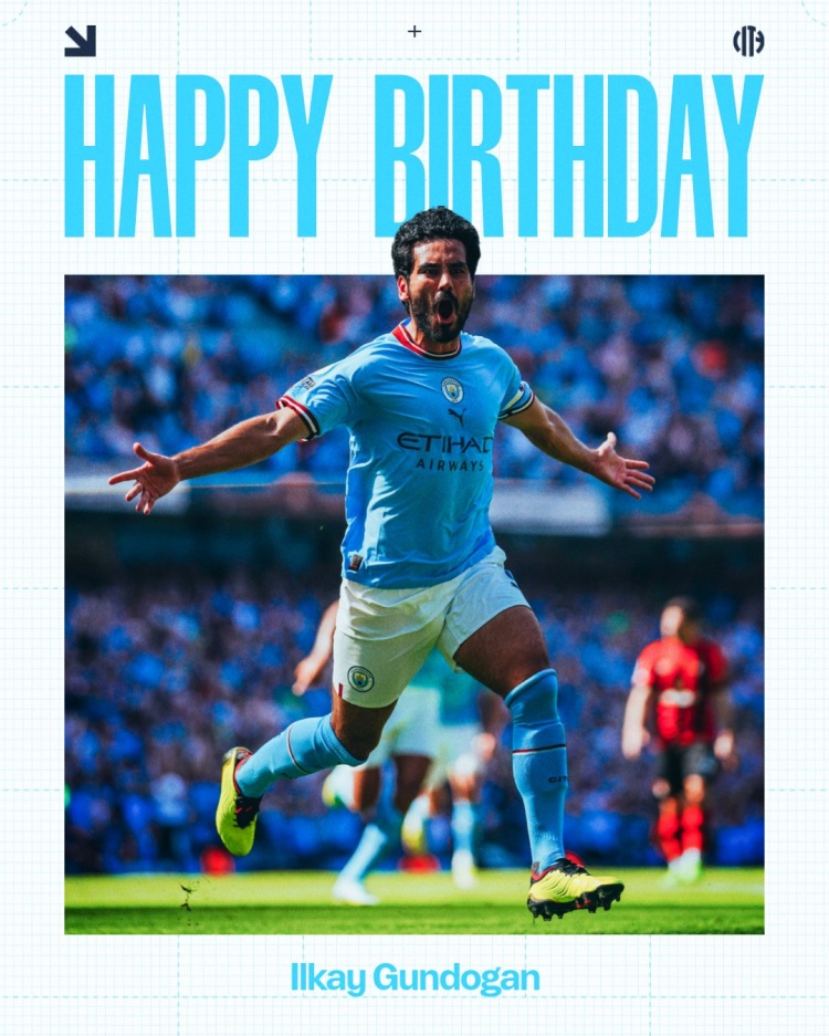 曼城官方社媒晒出京多安的寿辰海报,配文:“寿辰欢畅,伊尔凯。”